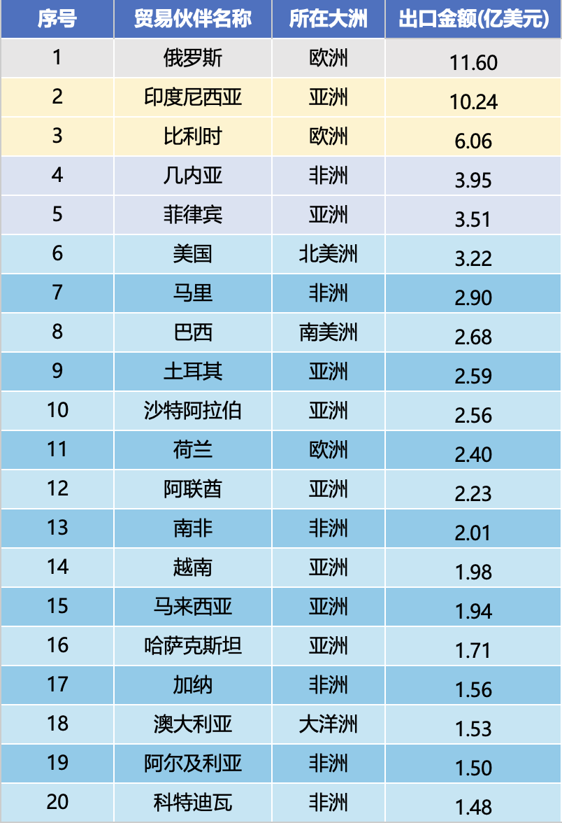 ຈາກການຈັດອັນດັບວົງເງິນສົ່ງອອກແຕ່ເດືອນມັງກອນຫາເດືອນທັນວາ 2025, 10 ປະເທດຄູ່ຮ່ວມມືການຄ້າອັນດັບໜຶ່ງແມ່ນ ຣັດເຊຍ (1,16 ຕື້ໂດລາສະຫະລັດ), ອິນໂດເນເຊຍ (1,024 ຕື້ໂດລາ), ແບນຊິກ (606 ລ້ານໂດລາສະຫະລັດ), ກີນີ (395 ລ້ານໂດລາສະຫະລັດ), ຟີລິບປິນ (351 ລ້ານໂດລາສະຫະລັດ), ສະຫະລັດ (322 ລ້ານໂດລາສະຫະລັດ), ມາລີ (290 ລ້ານໂດລາສະຫະລັດ), ບຣາຊິນ (268 ລ້ານໂດລາສະຫະລັດ), ບາຊິນ (268 ລ້ານໂດລາສະຫະລັດ) (256 ລ້ານໂດລາ). ຍອດມູນຄ່າການສົ່ງອອກຂອງ 10 ຕະຫຼາດອັນດັບໜຶ່ງບັນລຸ 4,93 ຕື້ໂດລາສະຫະລັດ, ກວມເອົາ 45,9% ຍອດມູນຄ່າການສົ່ງອອກທັງໝົດ, ໂດຍມີຕະຫຼາດຫຼັກຊັບສູງ.