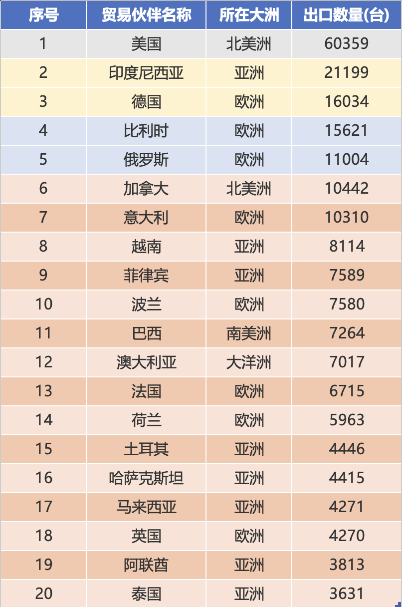 ກົງກັນຂ້າມກັບການຈັດອັນດັບດ້ານປະລິມານ, ອາເມລິກາມີມູນຄ່າການສົ່ງອອກຫຼາຍກວ່າ 60000 ເຄື່ອງ, ເປັນ 2,8 ເທົ່າຂອງອັນດັບສອງຂອງອິນໂດເນເຊຍ, ແລະ ລາຄາຫົວໜ່ວຍພຽງ 5000 ໂດລາຕໍ່ຫົວໜ່ວຍ, ໄດ້ຍົກໃຫ້ເຫັນລັກສະນະຕະຫຼາດເສດຖະກິດ; ການປະຕິບັດຂອງຕະຫຼາດເອີຣົບມີຄວາມປະທັບໃຈ, ມີເຢຍລະມັນ, ແບນຊິກ, ລັດເຊຍ, ອີຕາລີແລະໂປໂລຍທັງຫມົດຈັດອັນດັບໃນສິບ, ມີຈໍານວນການສົ່ງອອກທັງຫມົດ 61000 ຫນ່ວຍ, ກວມເອົາ 36,0% ຂອງປະລິມານທັງຫມົດຂອງຕະຫຼາດເທິງສິບ, ສະທ້ອນໃຫ້ເຫັນຄວາມຕ້ອງການຂະຫນາດໃຫຍ່ຂອງລົດຂຸດຂອງຈີນໃນຕະຫຼາດເອີຣົບ; ອິນໂດເນເຊຍ, ຫວຽດນາມ ແລະ ຟີລິບປິນໃນອາຊີຮັກສາລະດັບຄວາມຕ້ອງການທີ່ໝັ້ນທ່ຽງ, ດ້ວຍຍອດຈຳນວນການສົ່ງອອກ 37000 ໜ່ວຍ, ກາຍເປັນກຳລັງໜູນສຳຄັນຂອງດ້ານປະລິມານ.